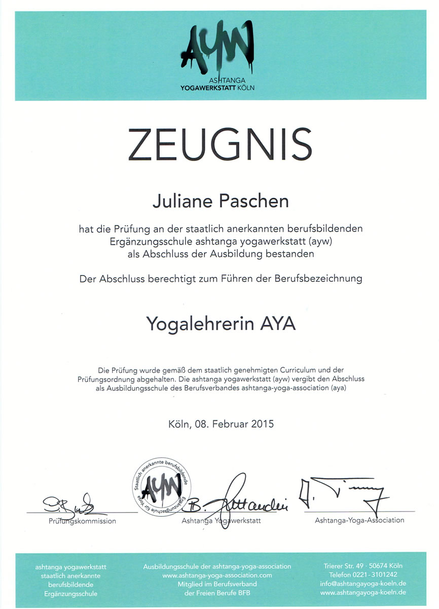 Im Februar 2015 habe ich die 3-jährige Ausbildung zur Ashtanga Yogalehrerin in der staatlich anerkannten Ergänzungsschule für Yoga, der Ashtangayogawerkstatt in Köln, bei Beate Guttandin (direkte Schülerin von Sri K. Pattabhi Jois) erfolgreich absolviert!